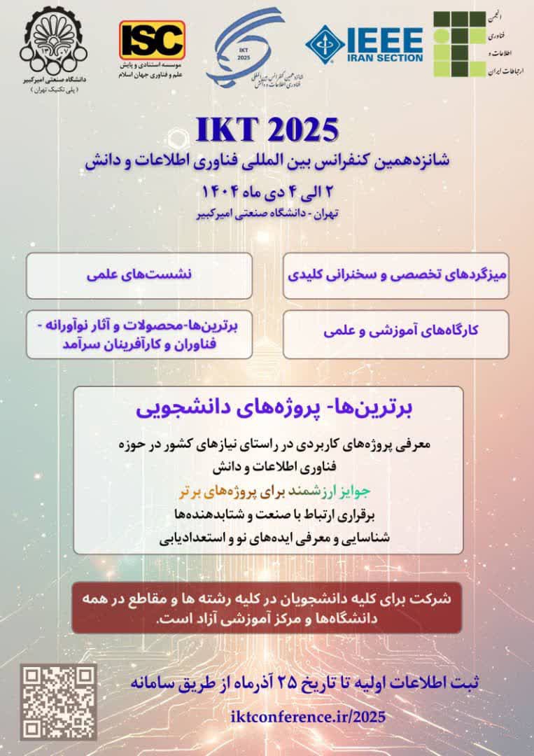 شانزدهمین کنفرانس بینالمللی فناوری اطلاعات و دانش از تاریخ 2 الی 4 دی ماه 1404 توسط انجمن فناوری اطلاعات و ارتباطات ایران و با همکاری دانشگاه صنعتی امیرکبیر برگزار می گردد. از جمله مهمترین رسالتهای این کنفرانس، رشد و توسعه دانش و فناوری اطلاعات و انتقال آخرین تجارب و دستاوردهای پژوهشی و صنعتی است. در این راستا از تمامی پژوهشگران، محققین، دانشگاهیان و صنعتگران دعوت به عمل میآید تا با ارسال جدیدترین مقالات و دستاوردهای خود در ایجاد اثربخشی مضاعف در راستای اهداف متعالی آن مشارکت فرمایند.